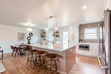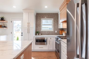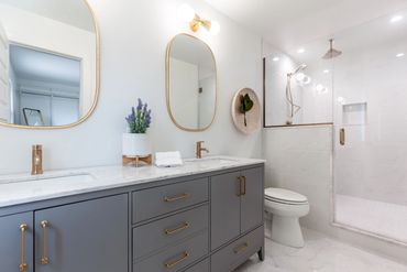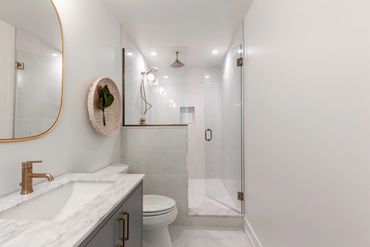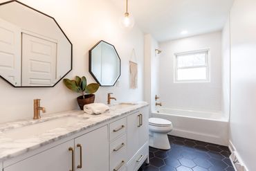 3 redesigned luxury bathrooms with designer tile and marble countertops